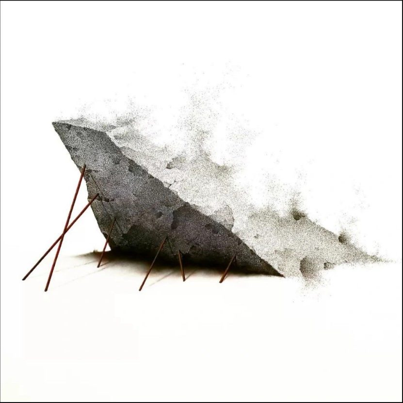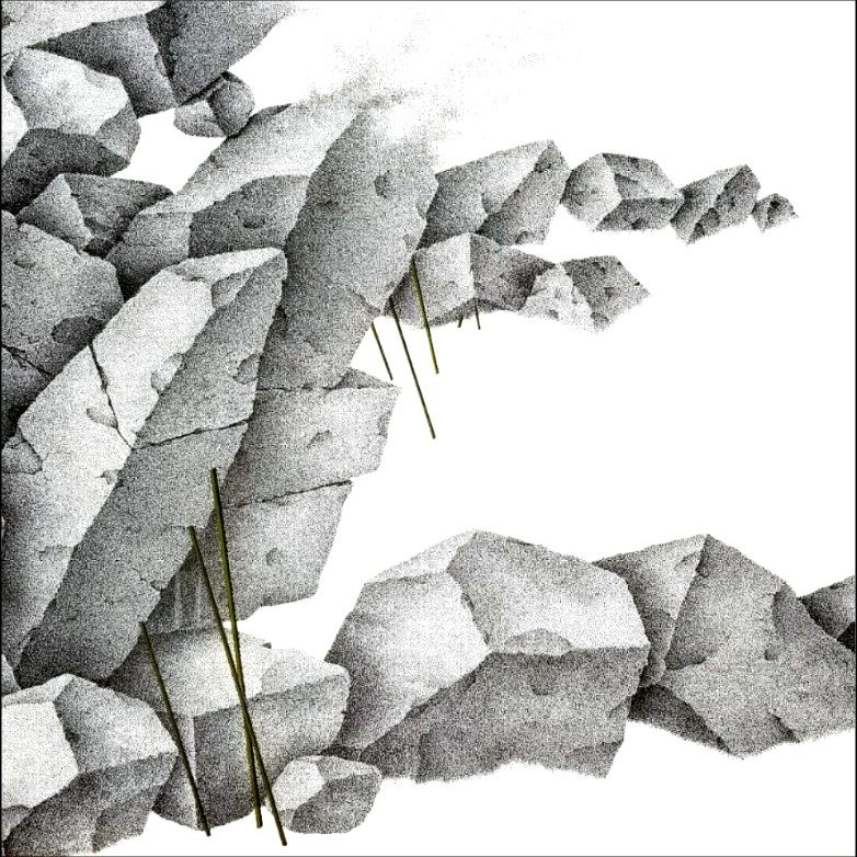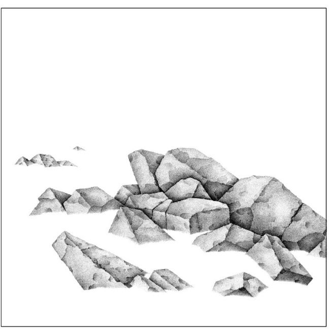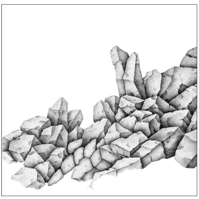 Les éboulis prennent forme librement sur le support, Dans un mouvement inverse. Je m'interroge sur la façon de les disposer, la voulant la plus naturelle possible. Aléatoire?