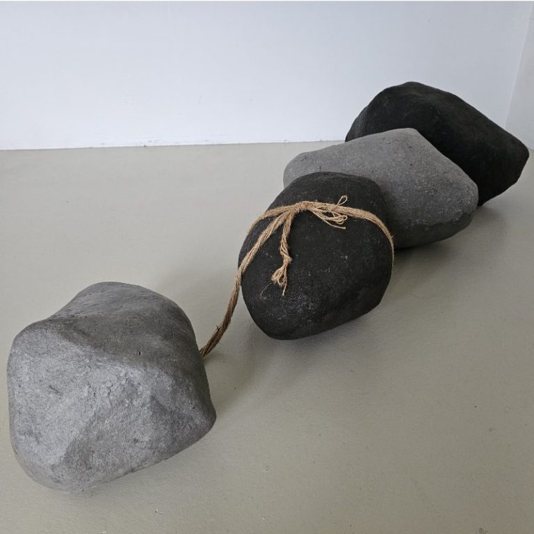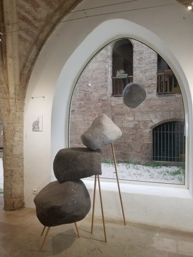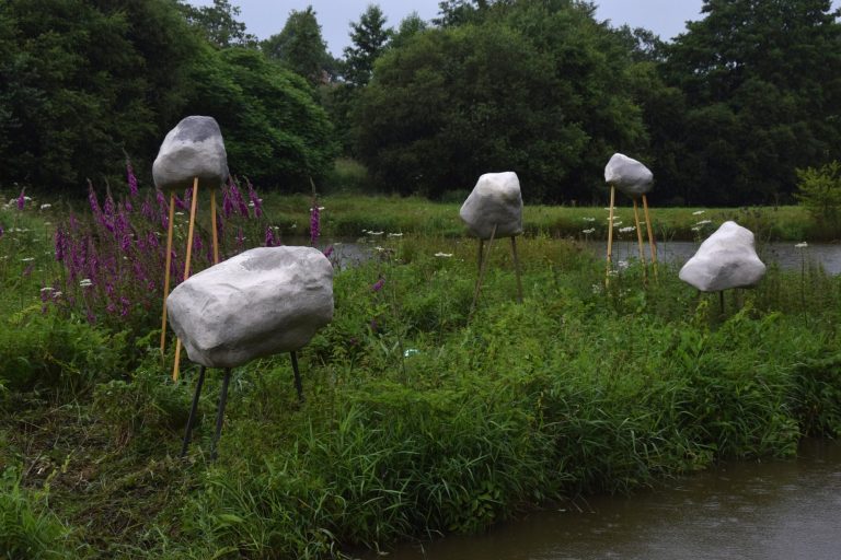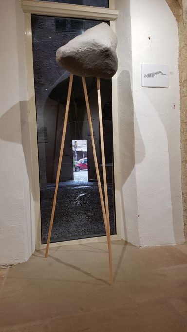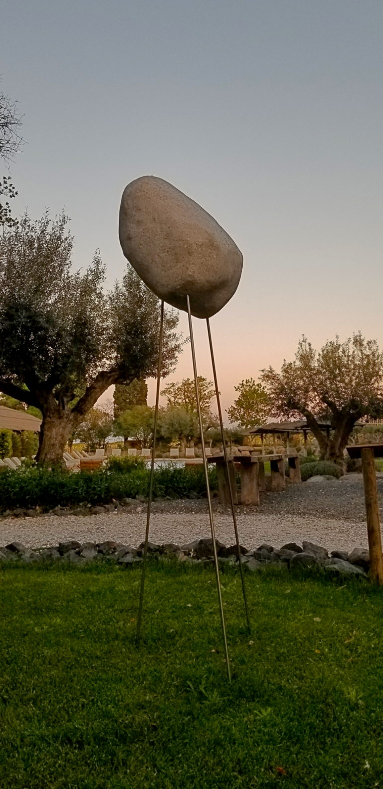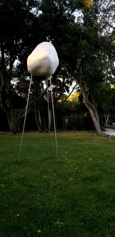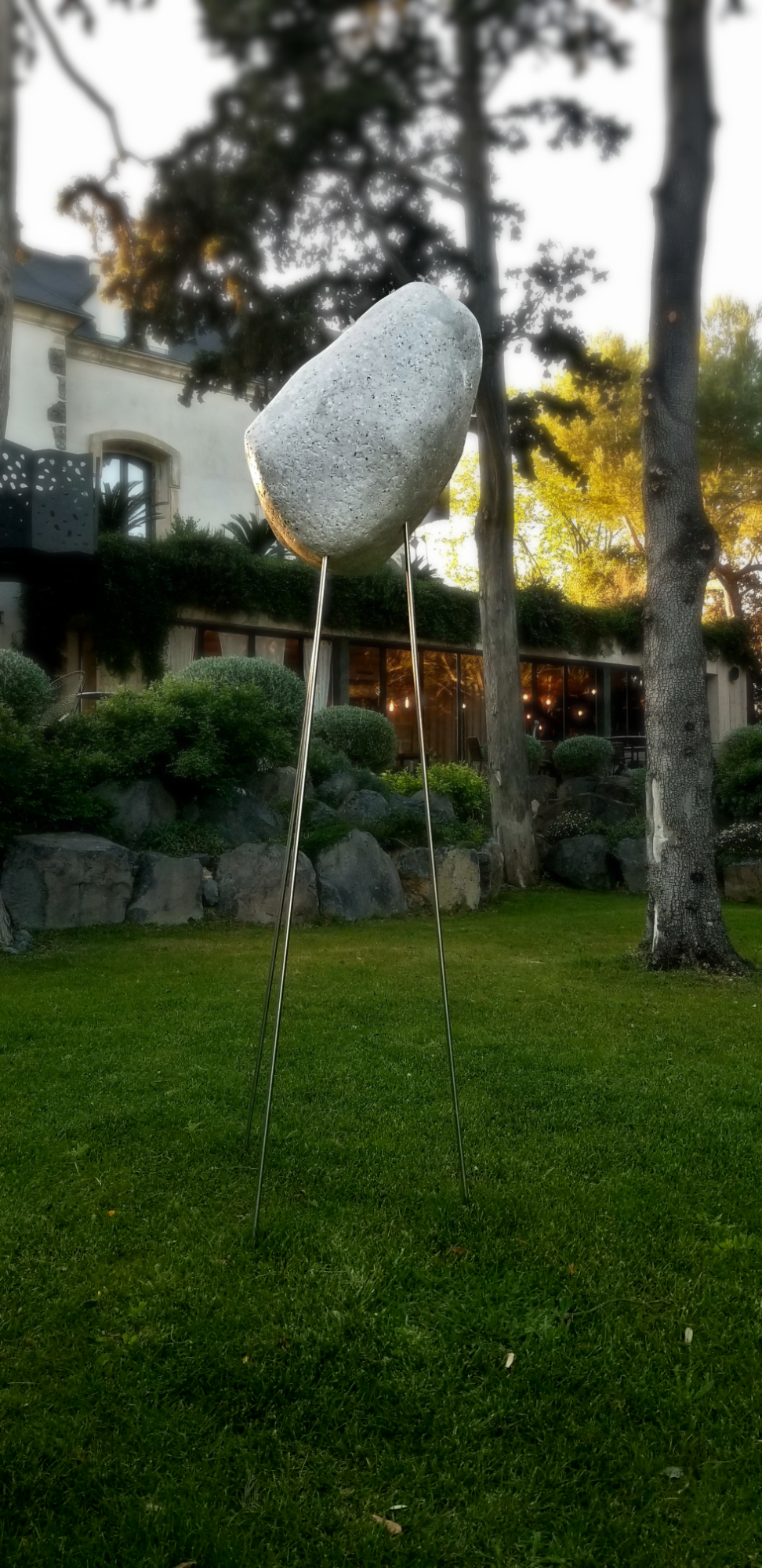 Les "rochers perchés" sur des étais fragiles et dans des équilibres improbables, interrogent la notion de "masse" et invitent à porter un regard oblique sur le simple caillou, posé là.